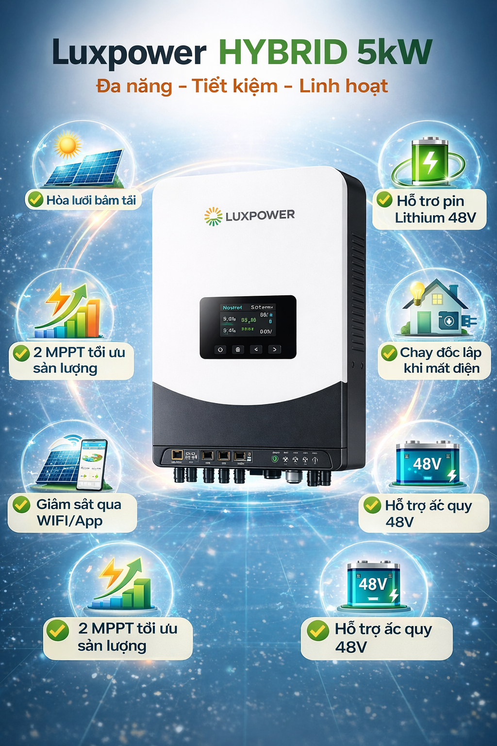 Inverter Hybrid Luxpower là một loại biến tần điện mặt trời đa năng do hãng Luxpower sản xuất, có khả năng kết hợp nhiều nguồn điện cùng lúc gồm: